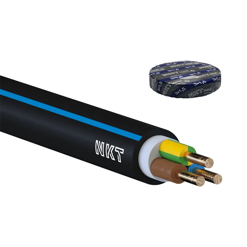 pro pevné uložení ve vnitřních a venkovních prostorách, UV odolný, odolný proti šíření plamene, třída reakce na oheň Eca, PVC izolace, pevné kruhové měděné vodiče typu RE, 3 žíly (hnědá, modrá, zelenožlutá), průřezy vodičů 1,5 mm2