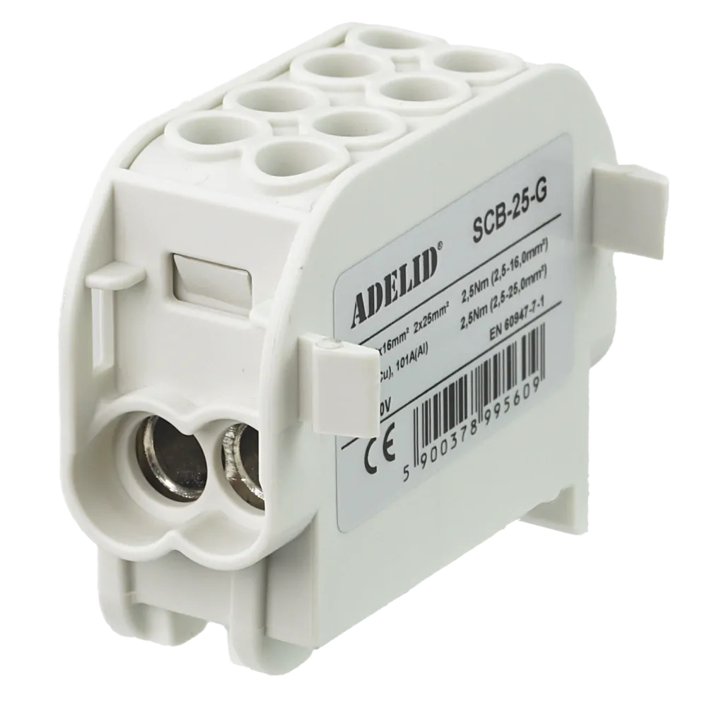 pro měděné i hliníkové vodiče, jmenovitý proud 100 A, 1pól, maximální průřez 25 mm2, 4 připojovací místa, barva šedá