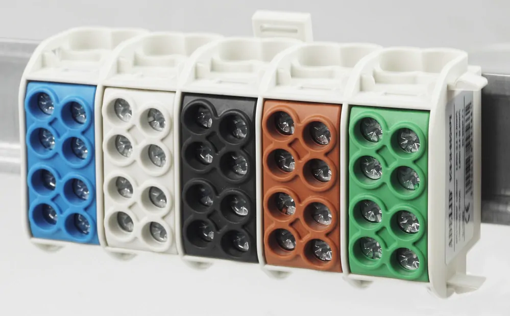 pro měděné i hliníkové vodiče, jmenovitý proud 100 A, maximální průřez 25 mm2, 4 připojovací místa v každé barvě, 5barev